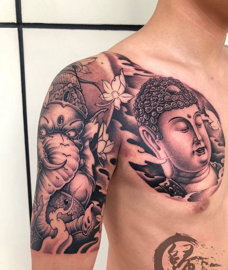 象神,佛半胛纹身图片_胸部手臂新传统象神佛头重庆纹身图案