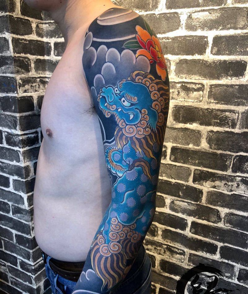 老传统唐狮花臂纹身图片_手臂手部老传统唐狮纹身图案