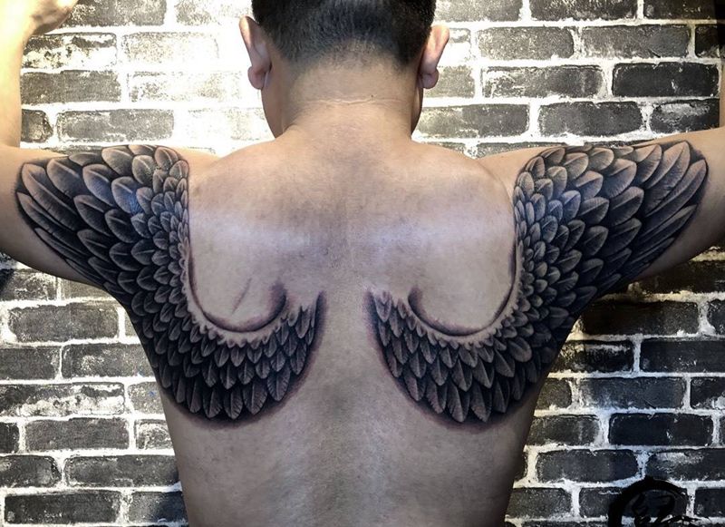 当前位置: 首页 >重庆市纹身店-歸刺青纹身图案>翅膀纹身图片_背部肩部新传统翅膀纹身图案