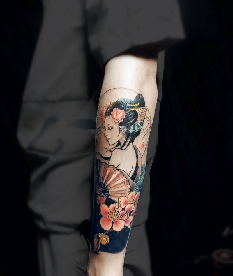 传统彩色艺妓纹身图片_手臂老传统纹身图案