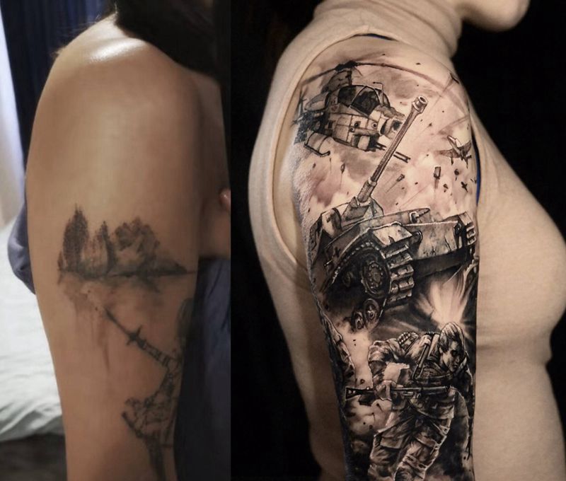 当前位置: 首页 >重庆市纹身店-仟刺青纹身图案>遮盖纹身图片_肩部欧美写实战争纹身图案