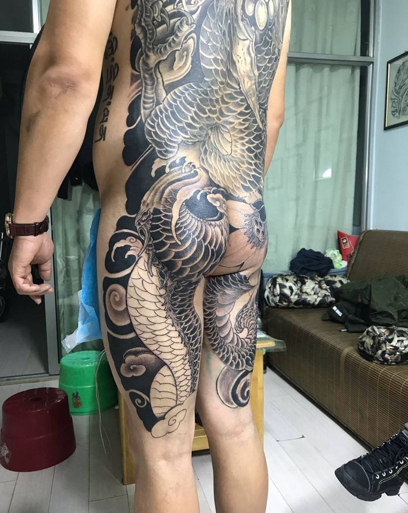 • T网红王老大花腿龙纹身图片_腿部新传统纹身图案