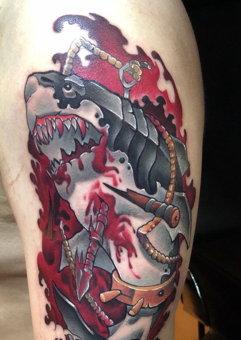 当前位置: 首页 >重庆市纹身店-重庆墨刺青tattoo工作室纹身图案>独角兽 鲨鱼纹身图片_腿部手臂New School纹身图案