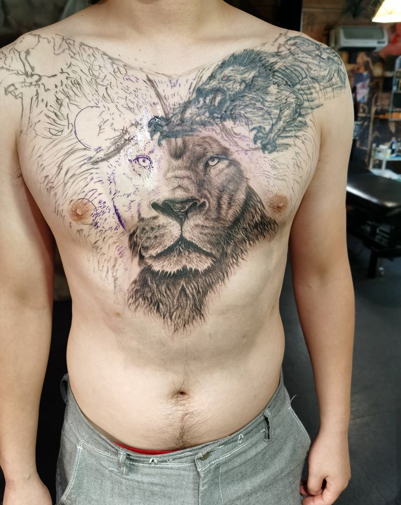 当前位置: 首页 >重庆市纹身店-子墨刺青工作室纹身图案>狮子纹身图片_胸部欧美写实点刺纹身图案