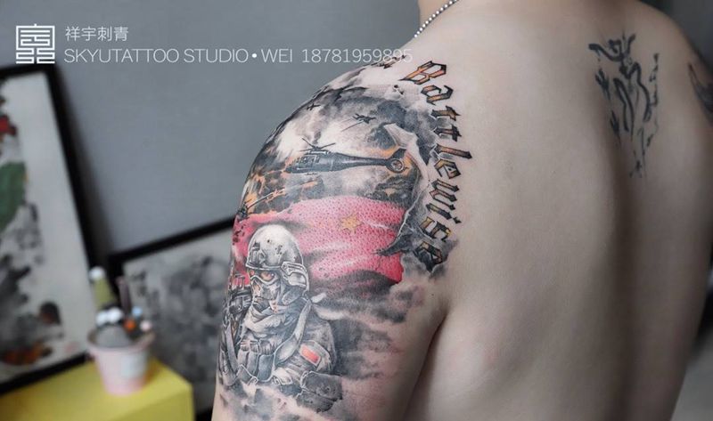 当前位置: 首页 >四川省成都市纹身店-成都祥宇私人定制纹身纹身图案>红色战魂纹身图片_成品手臂写实原创人物纹身图案