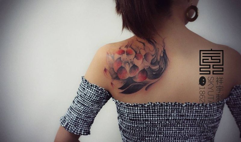 胎记遮盖纹身图片_背部水墨莲花纹身图案