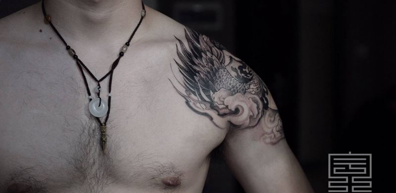凤鸣云盾纹身图片_手臂肩部新传统凤纹身图案