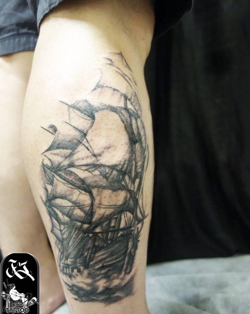 黑灰帆船纹身图片_腿部欧美写实静物成品以太政成都刺青纹身图案