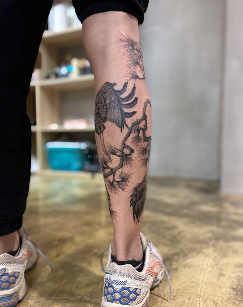 当前位置: 首页 >四川省成都市纹身店-部首刺青纹身图案>水墨 “松形鹤骨”纹身图片_腿部脚部水墨水彩仙鹤水墨国风纹身图案