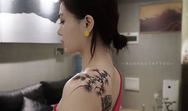 松树遮盖字母纹身图片_背部肩部水墨水彩纹身图案