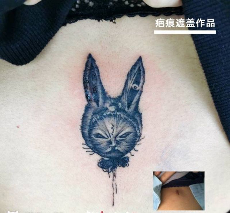 疤痕遮盖纹身图片_腹部兔子暗黑纹身图案