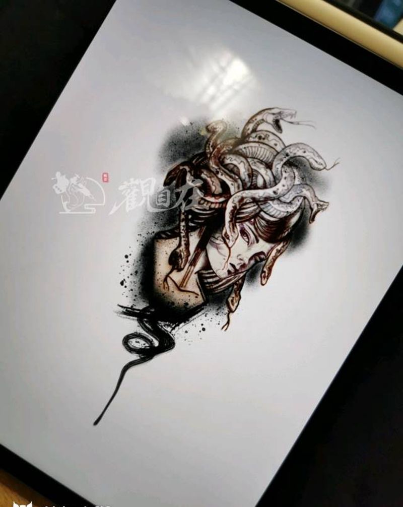 原创水墨美杜莎纹身图片_腿部水墨New School美杜莎蛇纹身图案
