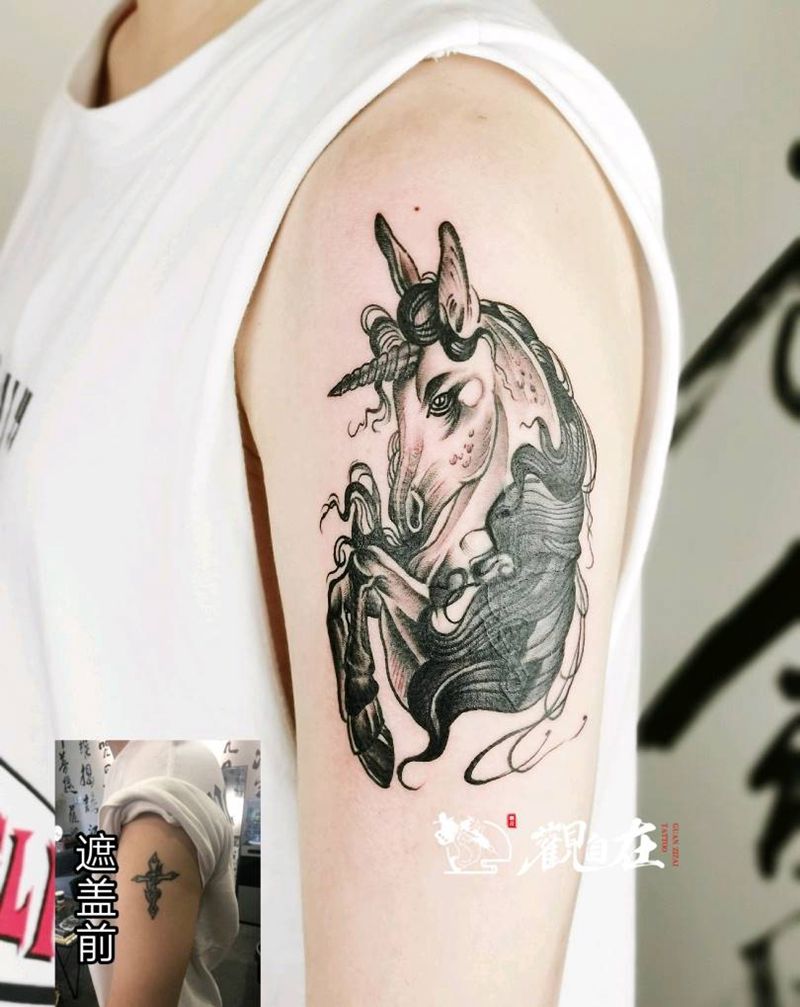 当前位置: 首页 >四川省成都市纹身店-观自在刺青纹身图案>独角兽纹身图片_手臂独角兽纹身图案
