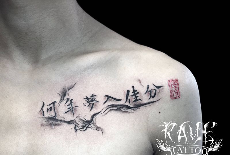 当前位置: 首页 >四川省成都市纹身店-Raye Tattoo纹身图案>书法纹身图片_胸部肩部水墨书法纹身图案