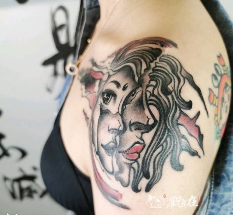 双重人格原创水墨纹身纹身图片_胸部肩部水墨纹身图案