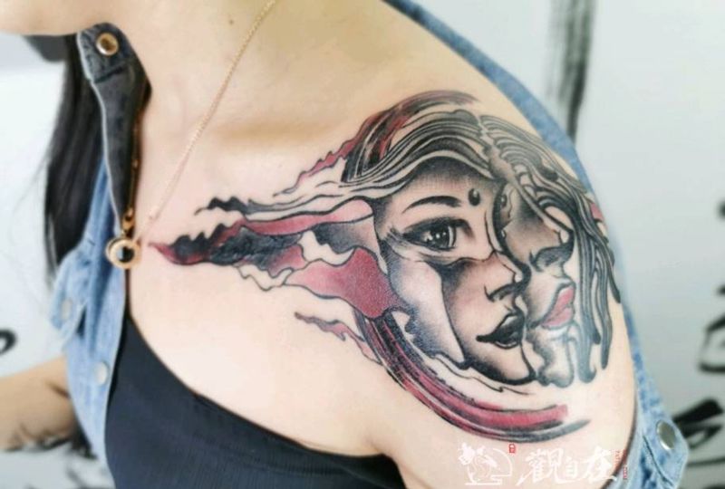 双重人格原创水墨纹身纹身图片_胸部肩部水墨纹身图案