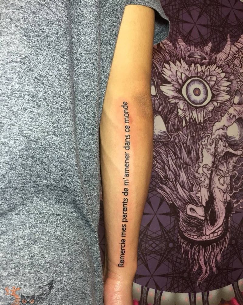 当前位置: 首页 >四川省成都市纹身店-Raye Tattoo纹身图案>标准字体法语.纹身图片_成品手臂欧美字符图腾原创纹身图案