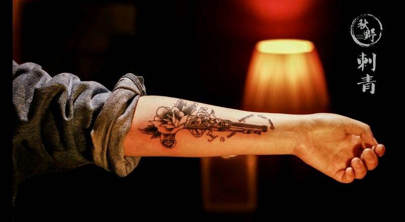 当前位置: 首页 >四川省成都市纹身店-成都怪兽巫纹身刺青工作室纹身图案>枪花纹身图片_手臂欧美植物静物成品纹身图案