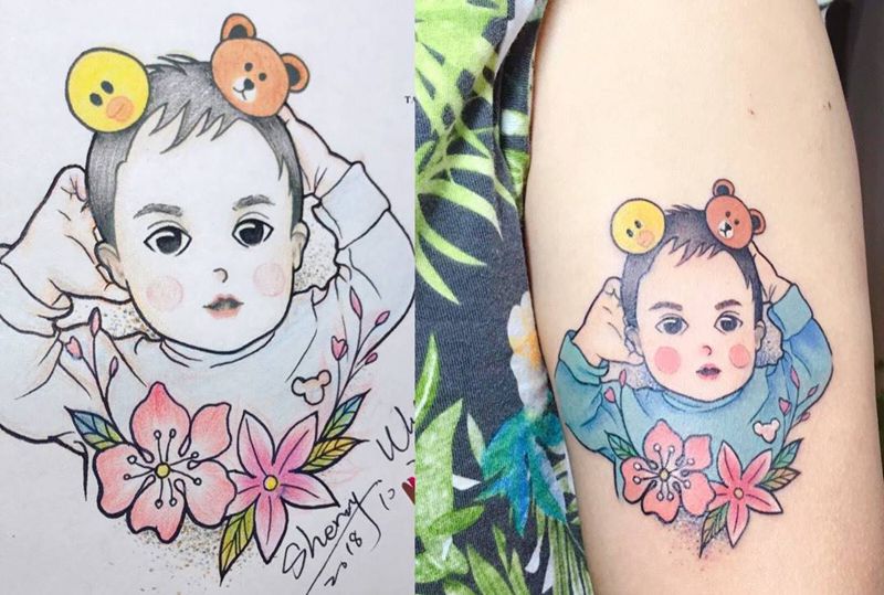 当前位置: 首页 >四川省成都市纹身店-TattooToday纹身图案>萌宝笑笑纹身图片_手臂New School肖像宝宝肖像纹身图案
