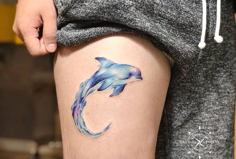 当前位置: 首页 >四川省成都市纹身店-TattooToday纹身图案>愉悦的海豚纹身图片_腿部水彩原创纹身图案
