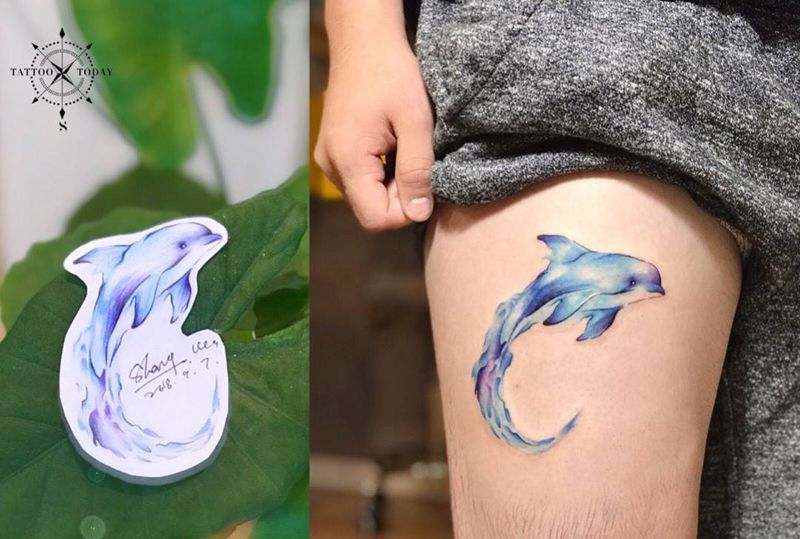当前位置: 首页 >四川省成都市纹身店-TattooToday纹身图案>愉悦的海豚纹身图片_腿部水彩原创纹身图案