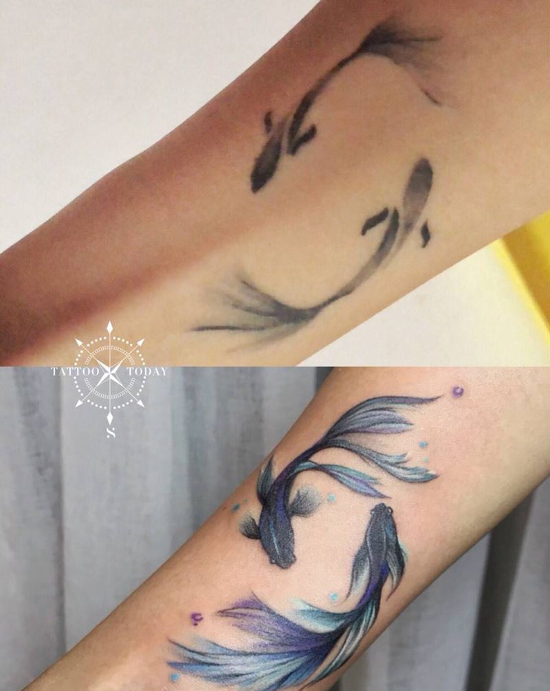 当前位置: 首页 >四川省成都市纹身店-TattooToday纹身图案>拯救双鱼纹身图片_手臂成品原创修改清新纹身图案