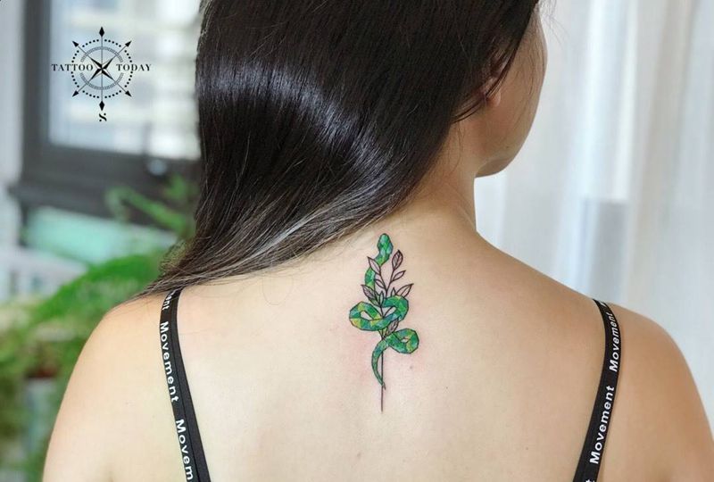 当前位置: 首页 >四川省成都市纹身店-TattooToday纹身图案>小青蛇纹身图片_颈部背部水彩蛇花草纹身图案