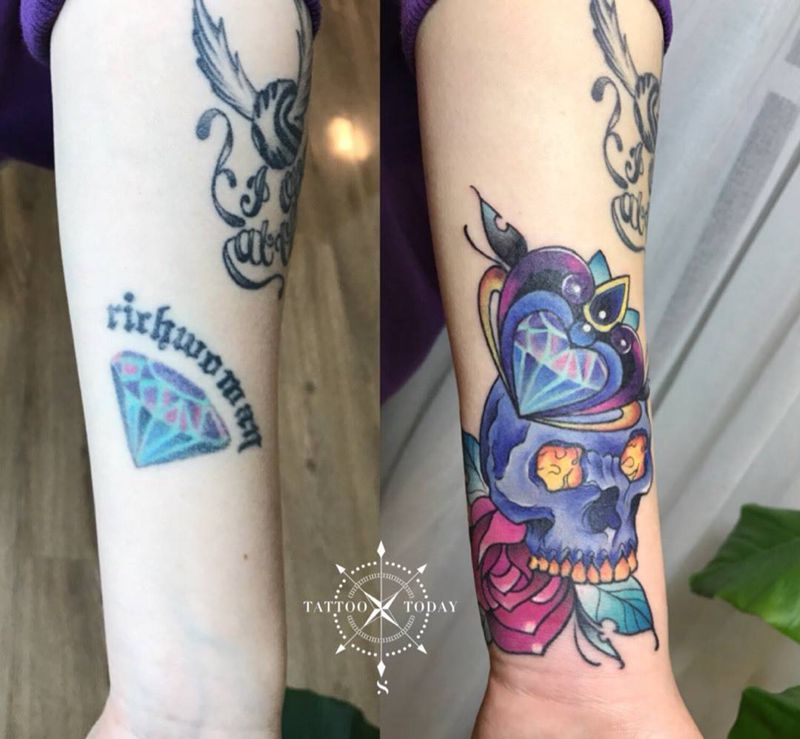 当前位置: 首页 >四川省成都市纹身店-TattooToday纹身图案>骷髅玫瑰遮盖纹身图片_成品手臂清新欧美鬼神植物宗教原创修改纹身图案