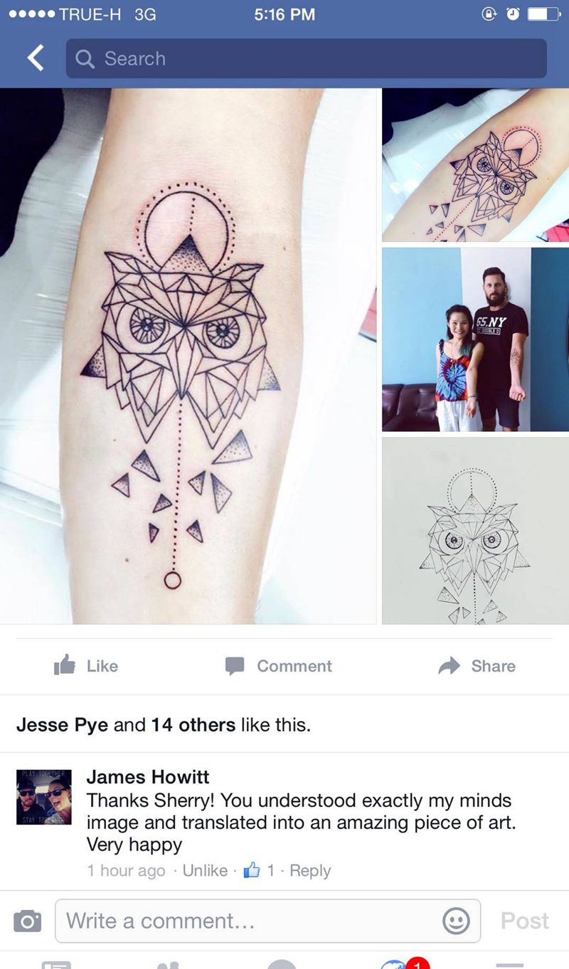 当前位置: 首页 >四川省成都市纹身店-TattooToday纹身图案>原创猫头鹰纹身图片_手臂欧美成品几何动物纹身图案