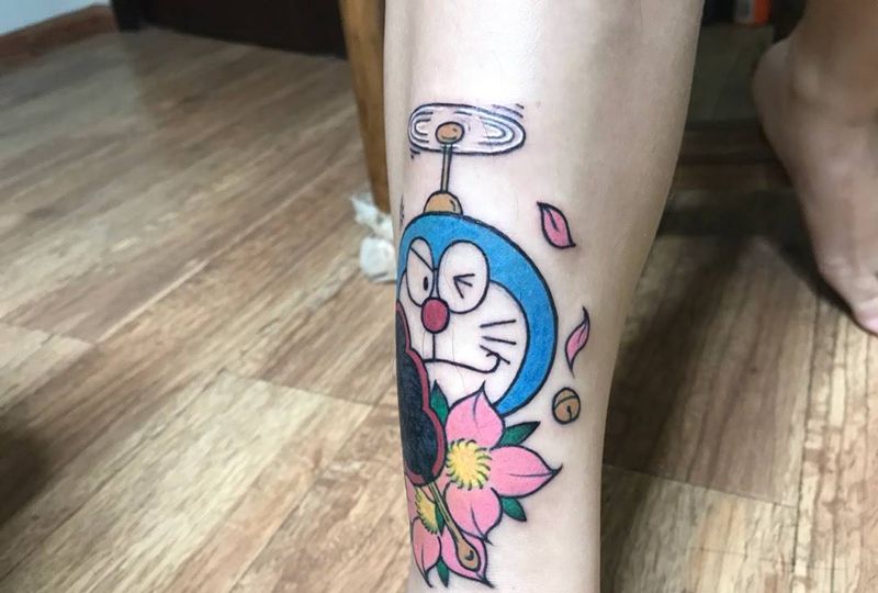 • T包小腿吹火男+阿多福纹身图片_腿部老传统新传统吹火男阿