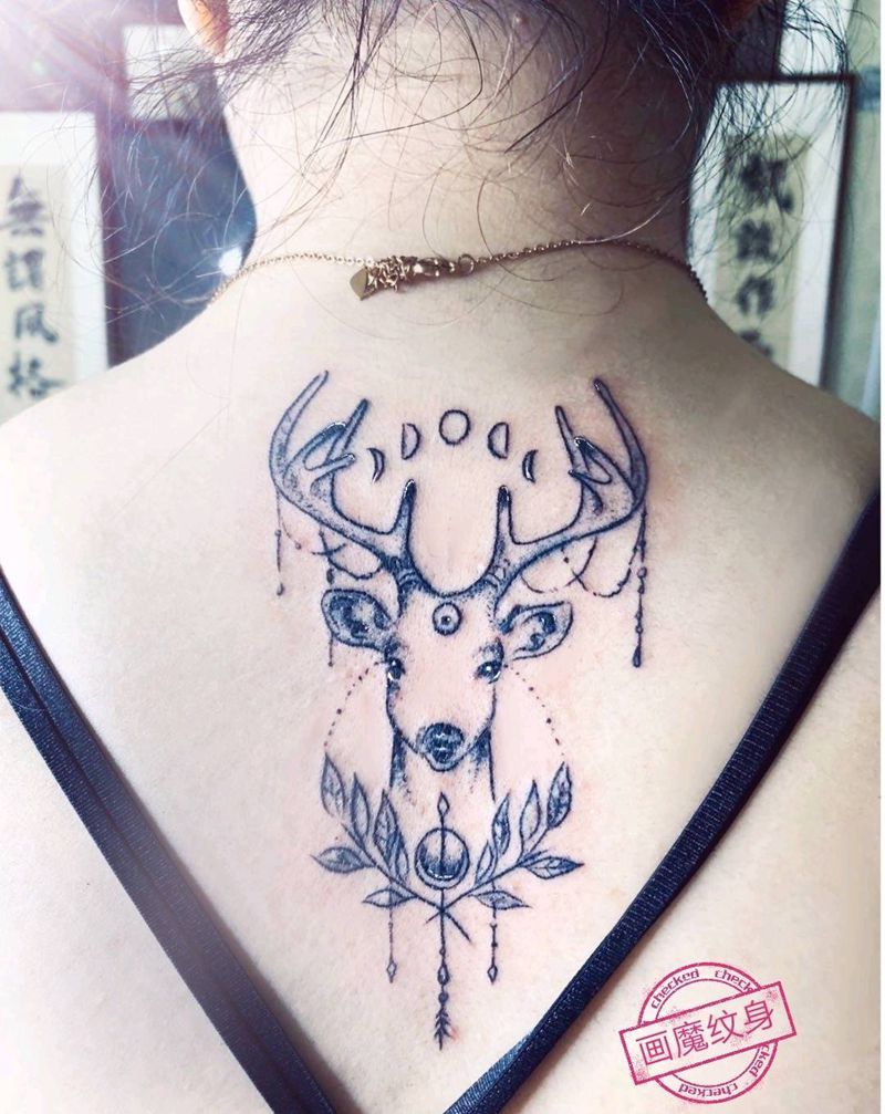小妹妹的小鹿纹身图片_背部点刺纹身图案