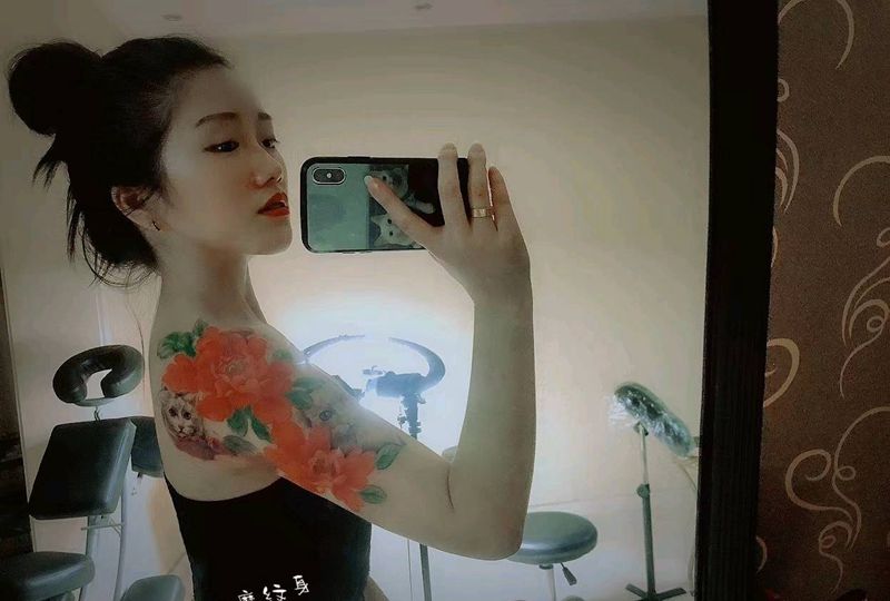 花开富贵,搭配她的两只猫纹身图片_肩部新传统纹身图案