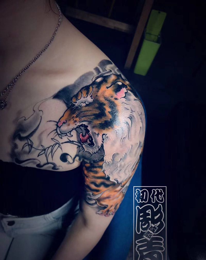 半胛严重烫伤疤痕遮盖纹身图片_手臂胸部新传统虎日式新传统疤痕遮盖纹身图案