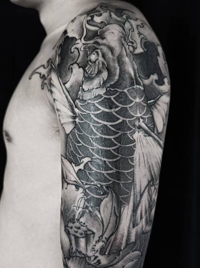 新传统遮盖鲤鱼纹身图片_手臂肩部新传统鱼新传统遮盖纹身图案