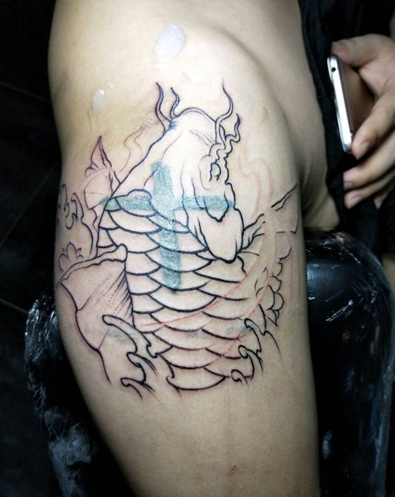 • T网红王老大花腿龙纹身图片_腿部新传统纹身图案
