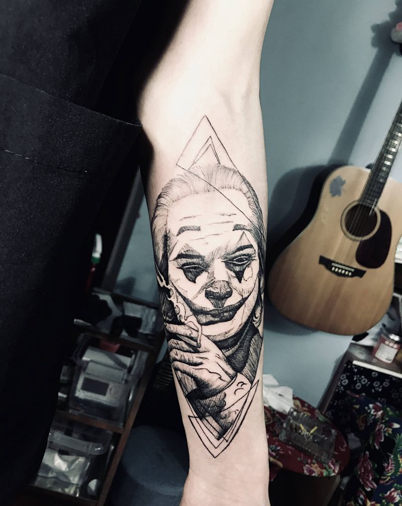 当前位置: 首页 >四川省成都市纹身店-辛刺青纹身图案>小丑纹身图片_手臂手部新传统欧美写实小丑线条纹身图案