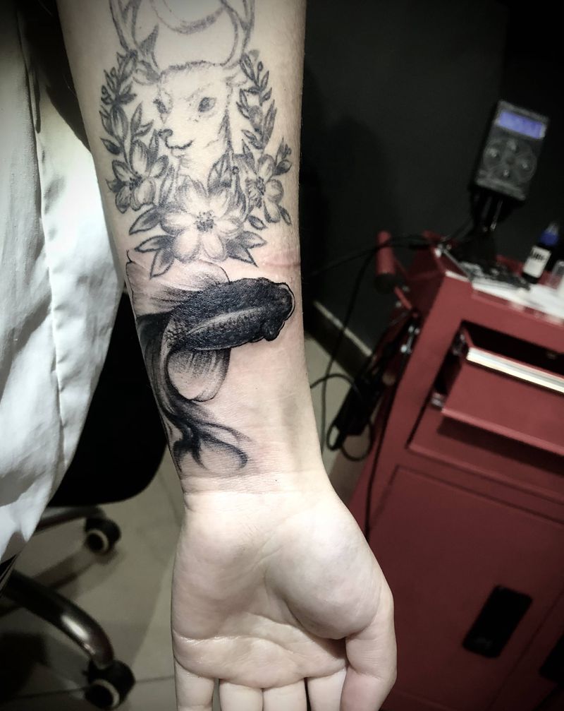当前位置: 首页 >四川省成都市纹身店-辛刺青纹身图案>遮盖纹身图片_手臂手部新传统水墨遮盖水墨鱼纹身图案