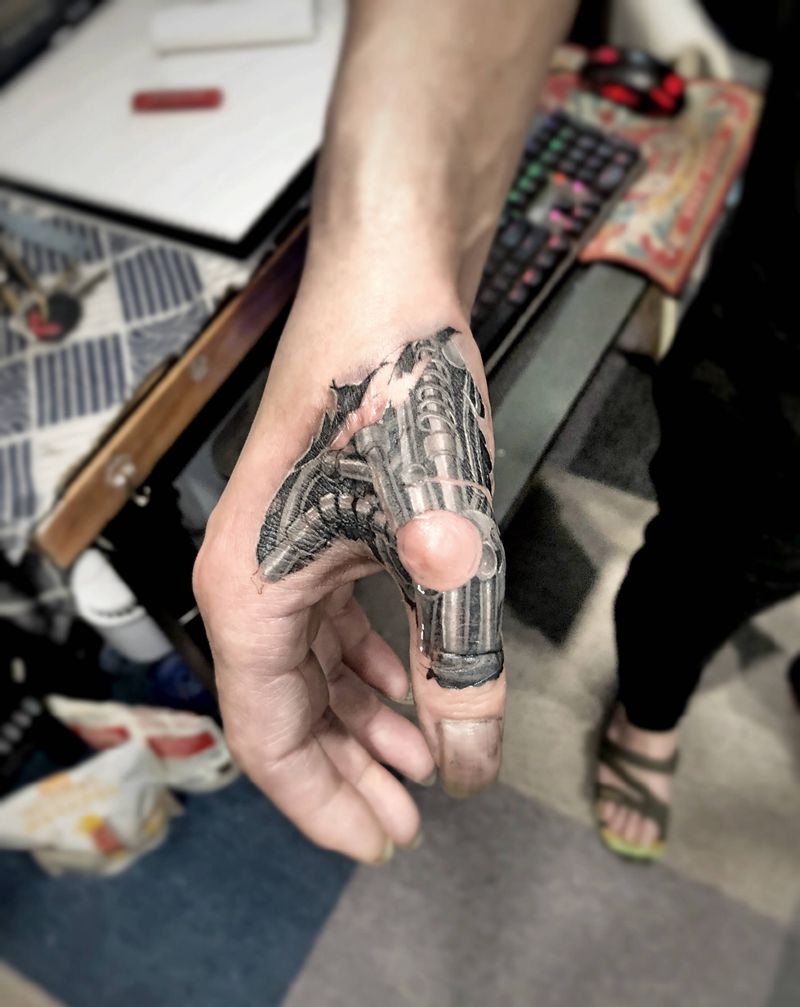 当前位置: 首页 >四川省成都市纹身店-摩根刺青纹身图案>原创伤疤遮盖机械纹身图片_手部欧美写实纹身图案
