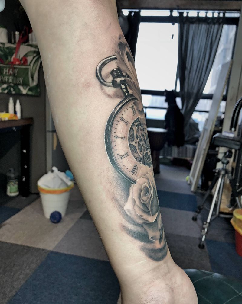 当前位置: 首页 >四川省成都市纹身店-摩根刺青纹身图案>钟与花纹身图片_手臂欧美写实纹身图案