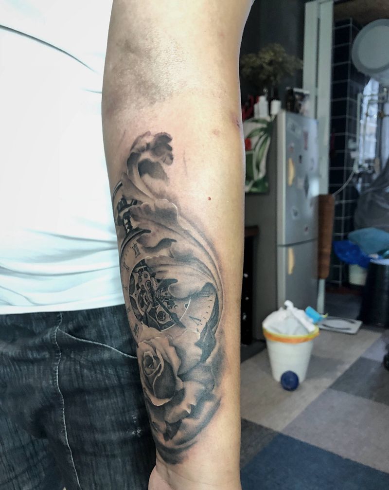 当前位置: 首页 >四川省成都市纹身店-摩根刺青纹身图案>钟与花纹身图片_手臂欧美写实纹身图案