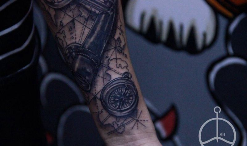 当前位置: 首页 >四川省成都市纹身店-梦途刺青纹身图案>航海图纹身图片_手部手臂成品欧美写实原创静物纹身图案