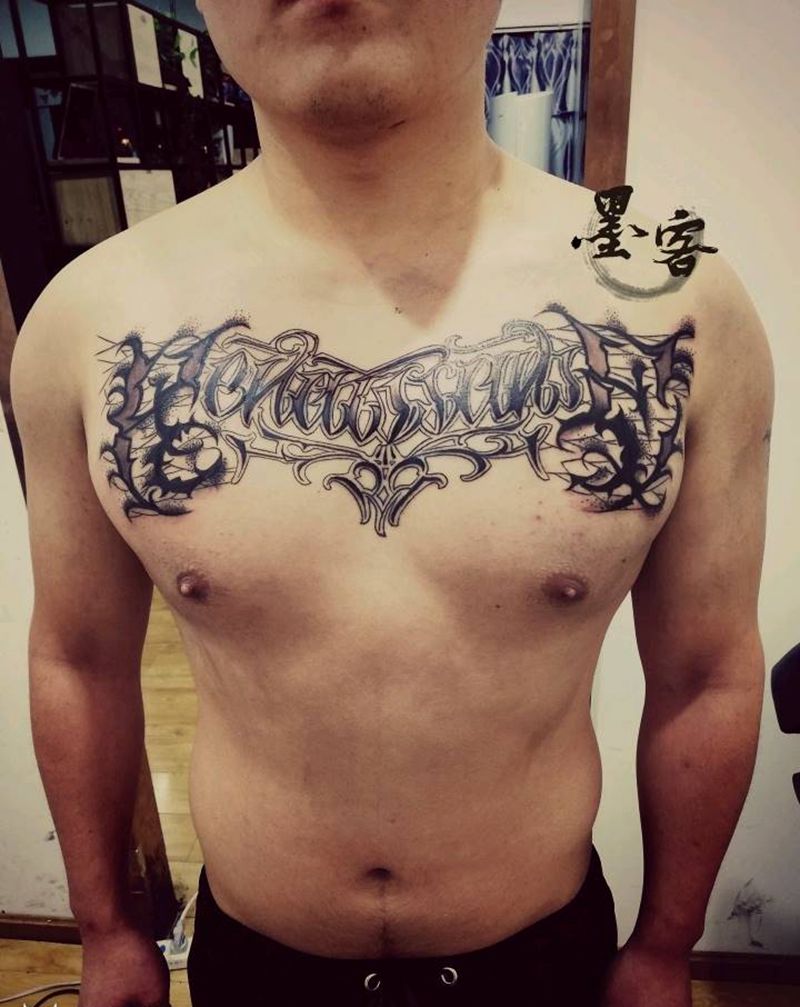 胸前花体英文纹身图片_胸部花体字新传统纹身图案