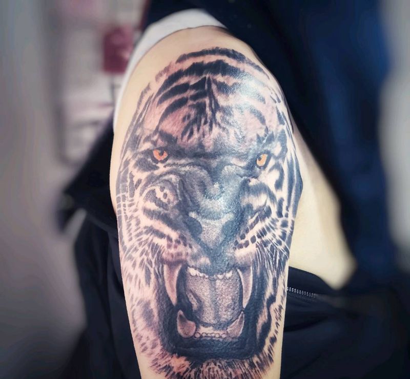 老虎遮盖纹身图片_手臂欧美写实老虎纹身图案