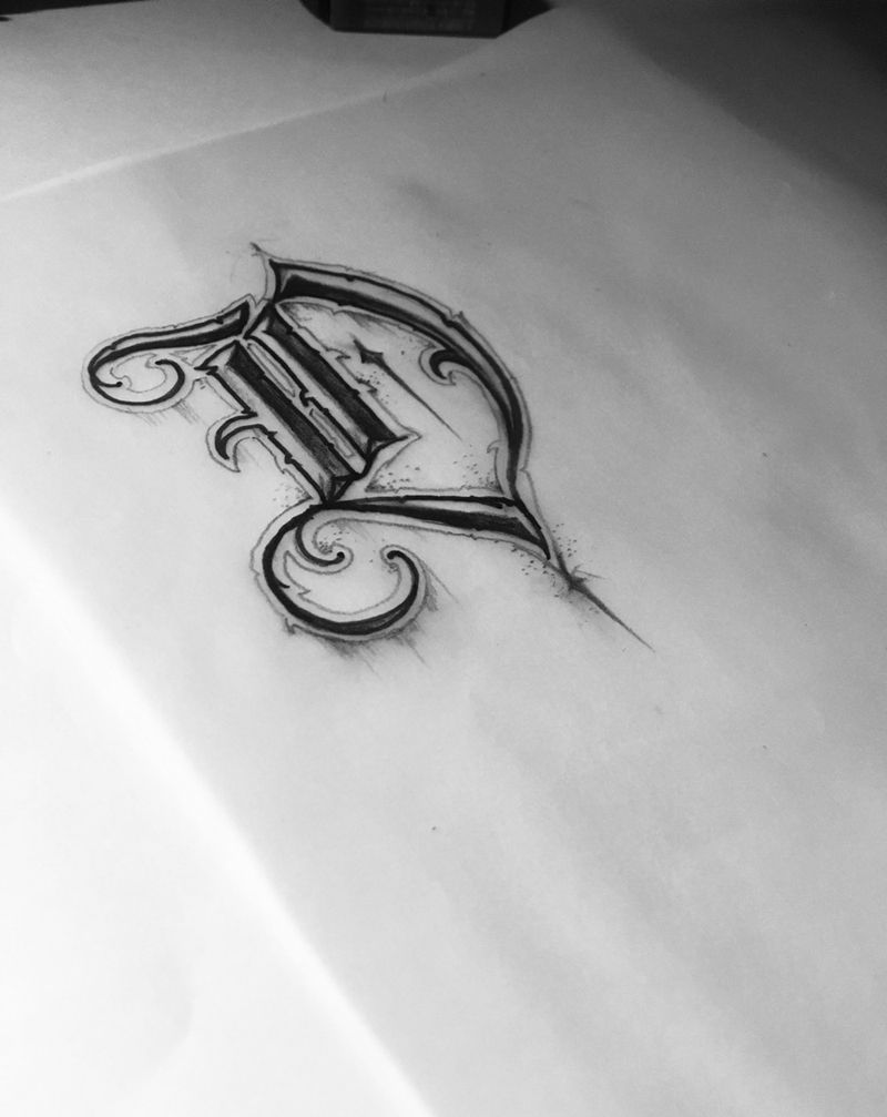 “D”的意志纹身图片_胸部几何花体字纹身图案