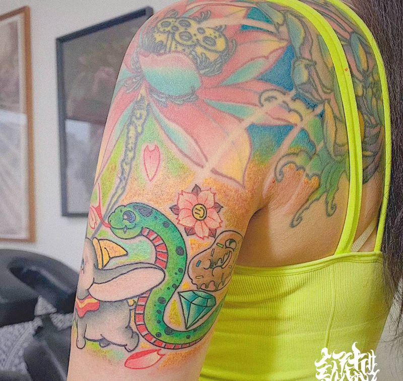 当前位置: 首页 >四川省绵阳市纹身店-幻刺纹身纹身图案>彩象和小蛇蛇荷花纹身图片_手臂纹身图案