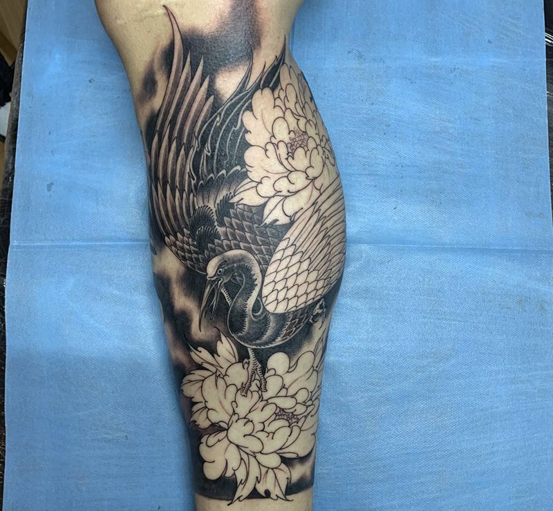 鹤,未完成纹身图片_腿部老传统纹身图案