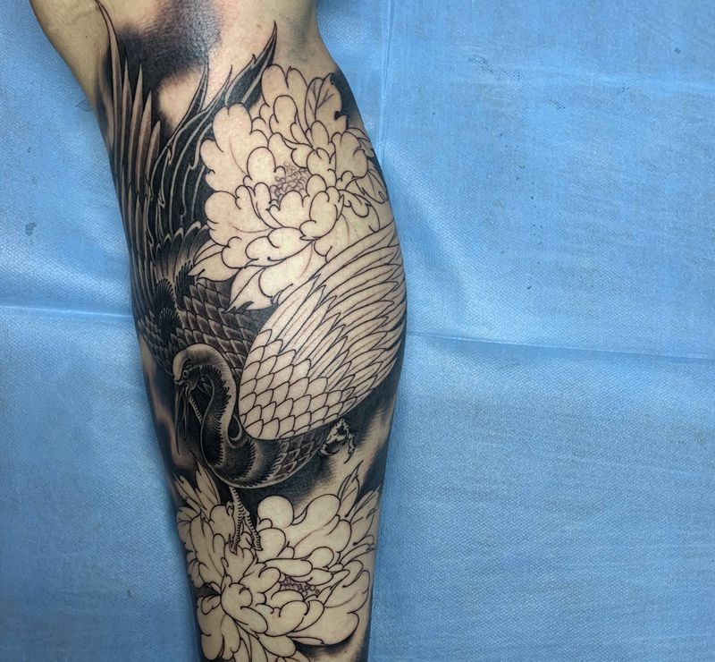鹤,未完成纹身图片_腿部老传统纹身图案