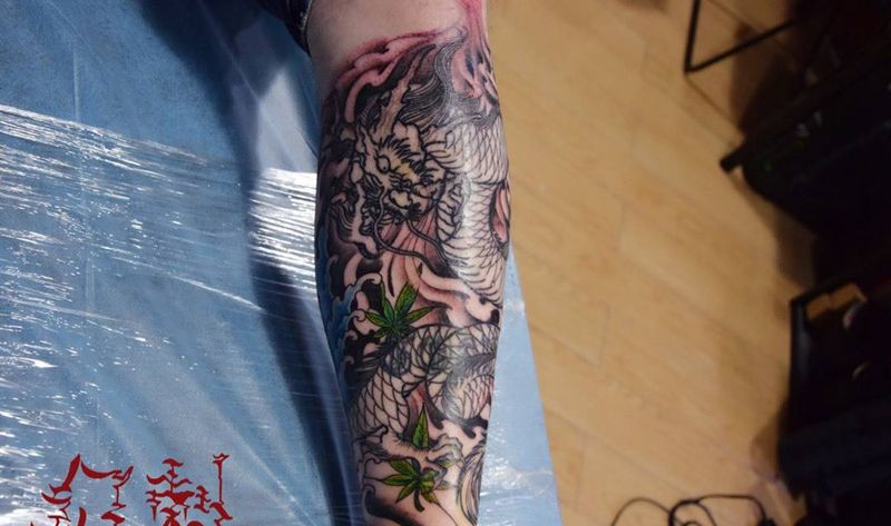 • T网红王老大花腿龙纹身图片_腿部新传统纹身图案