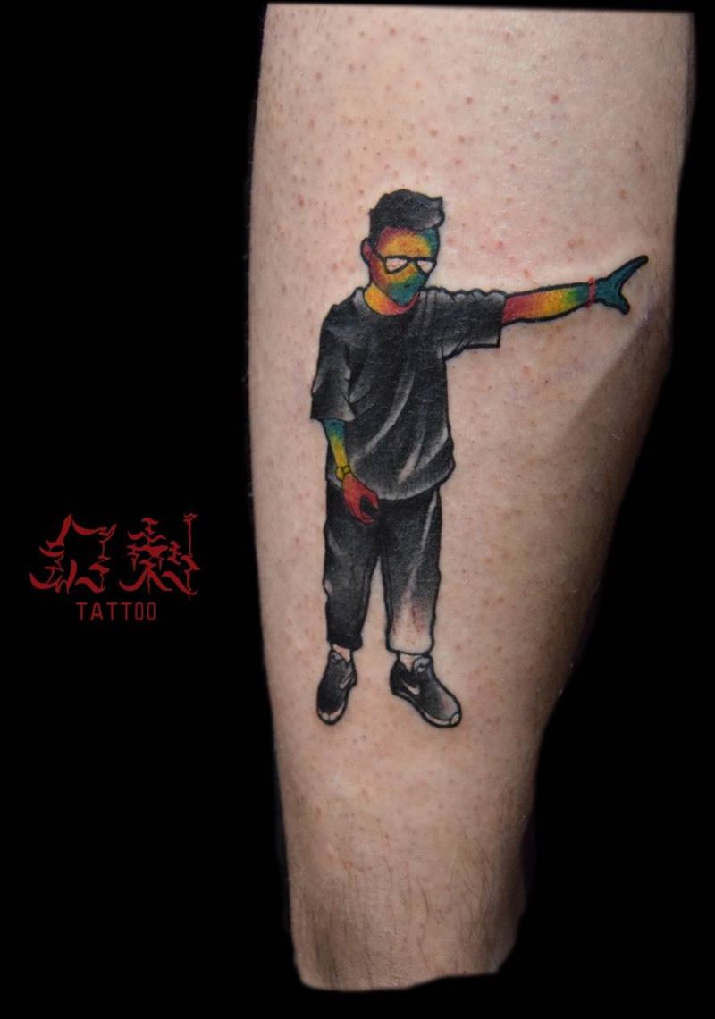 • T包小腿吹火男+阿多福纹身图片_腿部老传统新传统吹火男阿