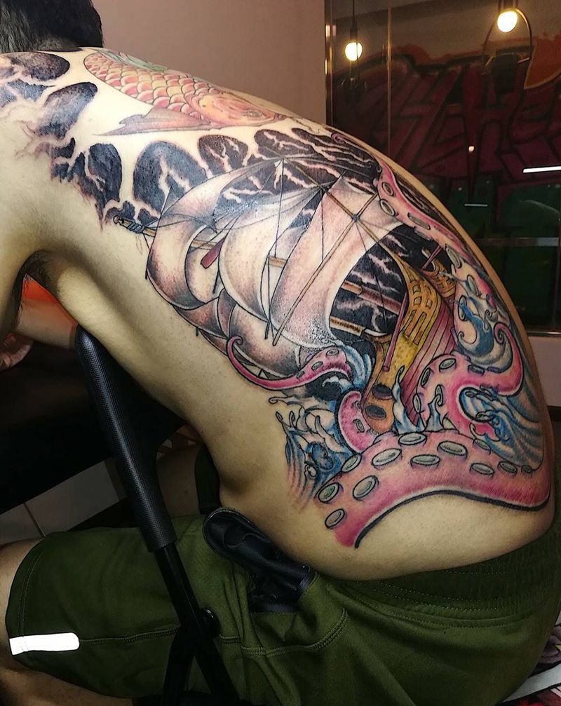章鱼之势幻刺明媚纹身图片_传统动物原创背部成品纹身图案